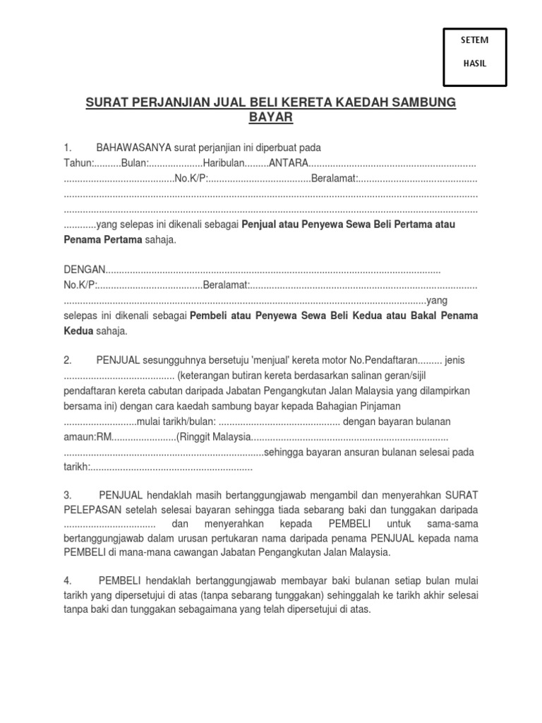14 Contoh Surat Agreement Sambung Bayar Kereta from i2.wp.com Contoh surat perjanjian ini berisi penyerahan tanah dari penjual ke pembeli serta berhak menerima. Surat jual beli tanah merupakan sebuah surat yang dibuat yang mana isi dari surat tersebut menginformasikan bahwasanya pada tanggal dan waktu tertentu telah dilakukan akad atau transaksi jual beli tanah antara pihak pertama dengan pihak kedua atau juga bisa disebut antara pihak penjual. Perjanjian ini memiliki kekuatan hukum yang sama bagi para pihak dan mulai berlaku sejak selesai penandatanganan perjanjian tersebut. Surat perjanjian jual beli tanah ini, dibuat oleh pihak penjual dan pembeli untuk menjelaskan hak serta kewajiban yang tidak boleh dilanggar oleh kedua belah pihak. Surat tersebut berfungsi sebagai bukti bahwa kesepakatan antara penjual nah, demikianlah pembahasan seputar surat perjanjian jual beli rumah beserta contohnya yang patut anda cermati. Dalam surat perjanjian jual beli tanah ini disebut sebagai pihak pembeli. Yang bertanda tangan dibawah ini : Fungsi surat perjanjian untuk menjelaskan kewajiban dan hak kedua belah pihak, kewajiban pembeli membayar uang kepada penjual, dan penjual berhak atas uang tersebut.