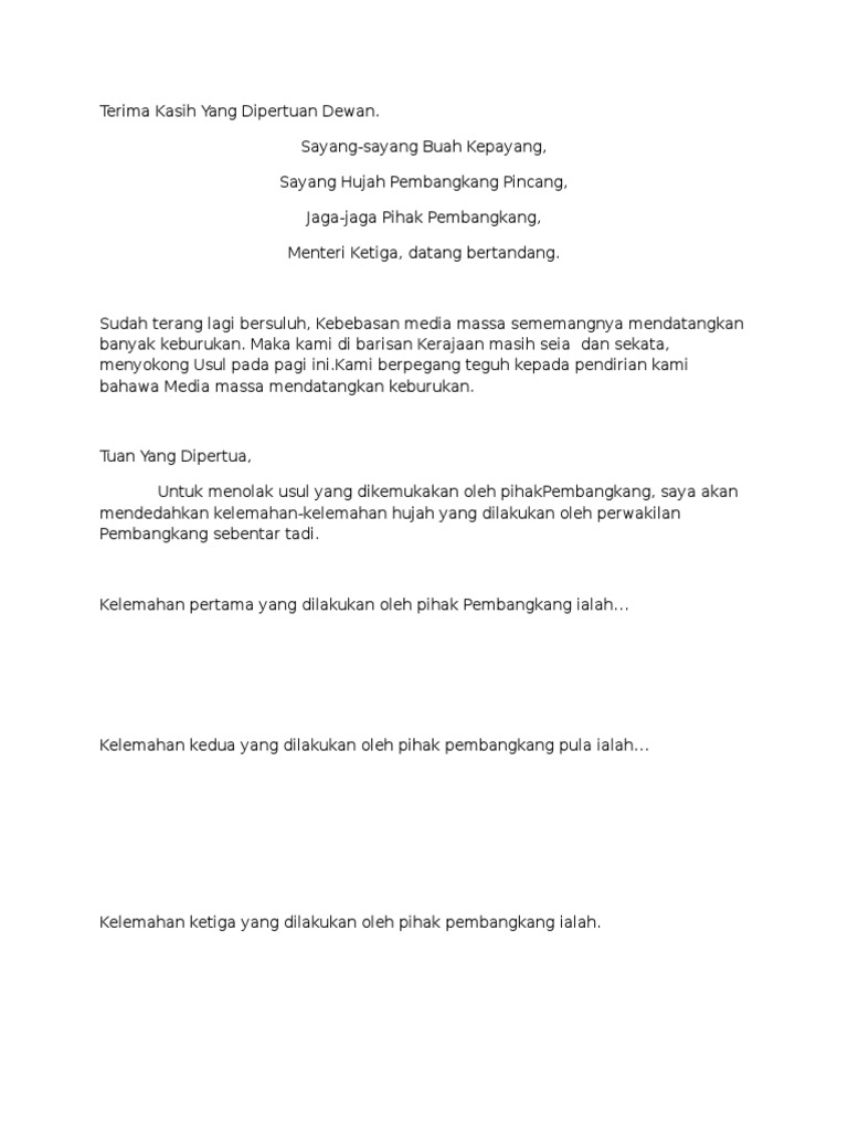 Contoh Teks Pendahuluan Bahas Ala Parlim Doc Contoh Teks Pendahuluan Bahas Ala Parlimen Dengan Lafaz Saya Membuka Arena Perdebatan Pada Hari Ini Course Hero from www.coursehero.com Tidak hanya ilmuwan, pelajar pun tak jarang melakukan beberapa kegiatan percobaan semasa sekolah. Contoh teks bahas ala parlimen (menteri ketiga pembangkang) teks ucapan anugerah cemerlang pengetua. Smkrpmtf (pembangkang) vs smk derma (kerajaan). Sekian satria tunggal chunghua mohon mencadang. Dalampertandingan bahas ala parlimen ini pengundian sebenarnya tidak berlaku tetapikeputusannya ditentukan oleh hakim bahas. Wakil pembangkang mahu yang dipertua dan timbalan yang dipertua dewan rakyat dikekalkan. 5 5 upvotes 7 7 downvotes. Teks bahas ala parlimen (menteri kedua).